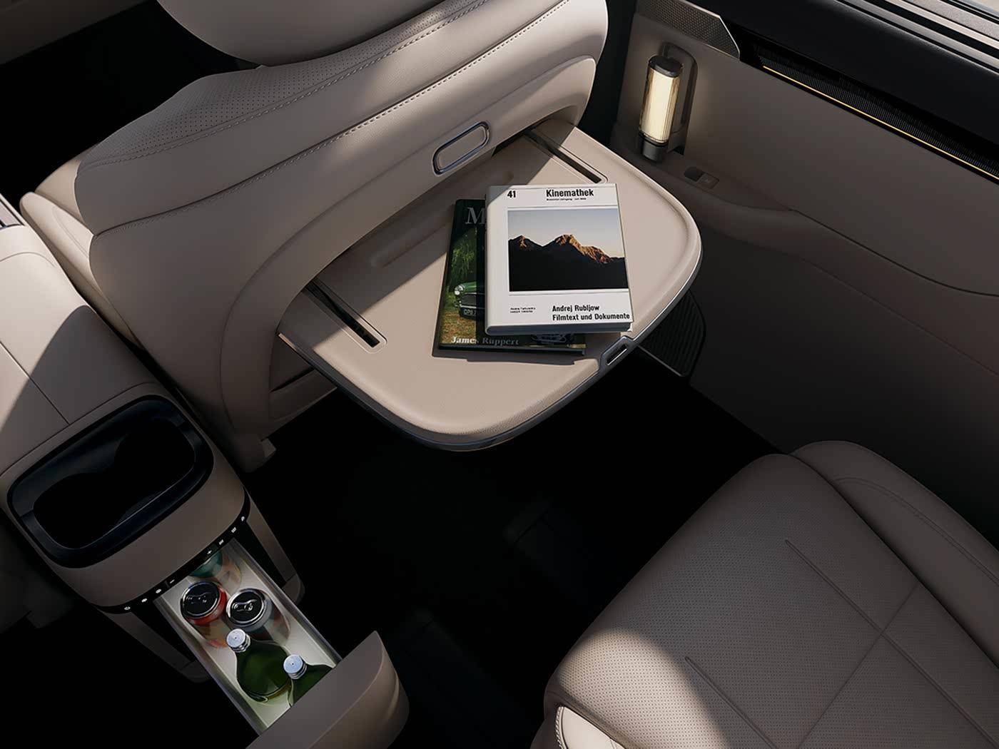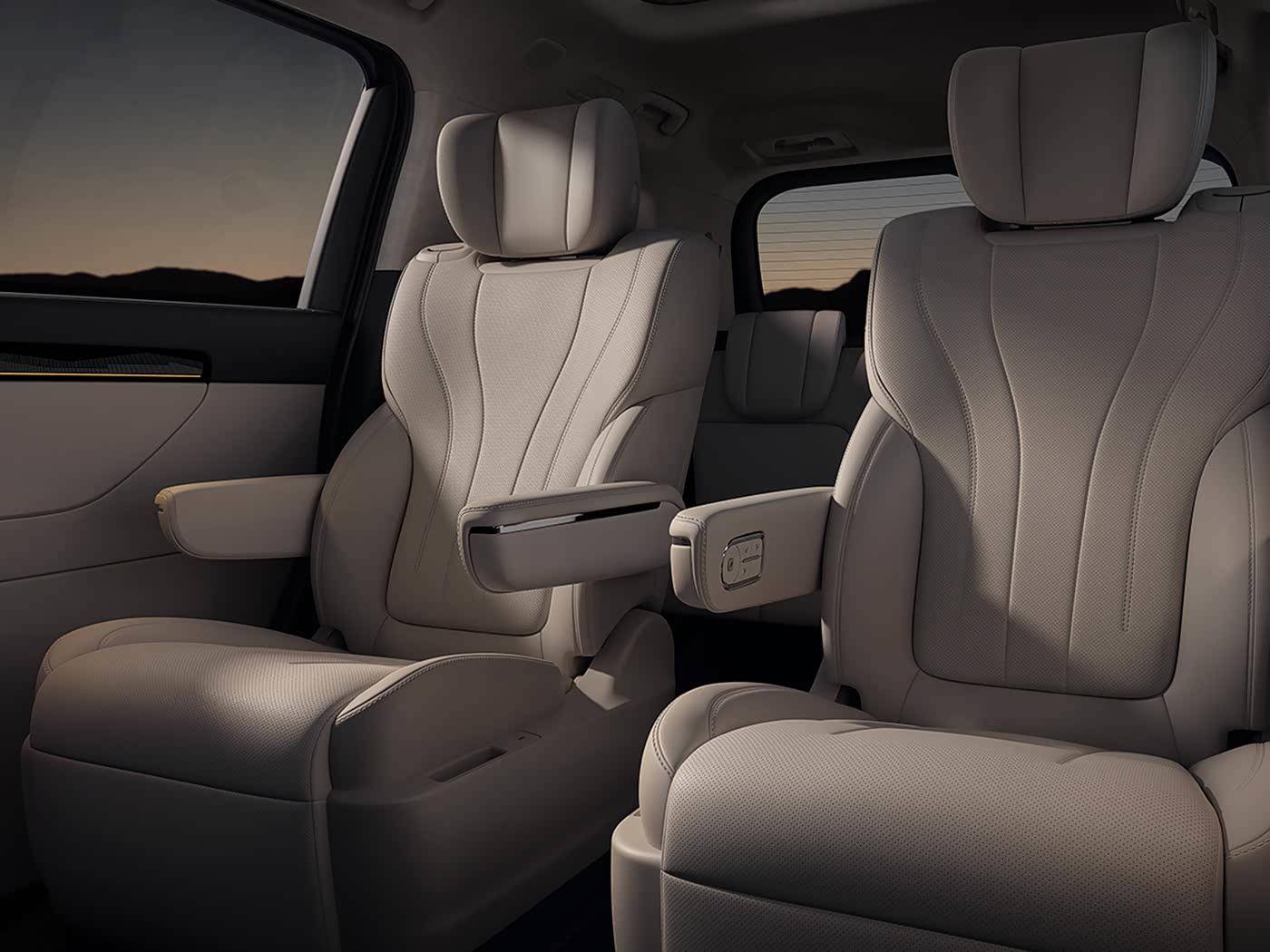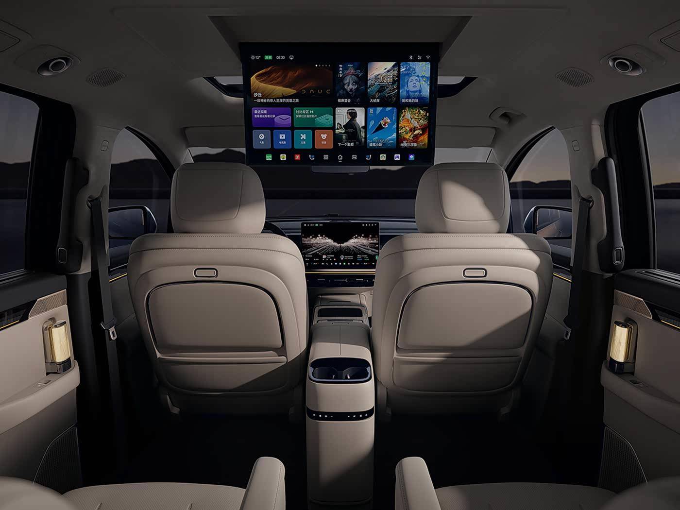 作为一台MPV,二排无疑才是最大的看点。从下图中可以看到,像电视、二排独立座椅、小桌板、冰箱都没缺席。另外,二排座椅还支持腿托、加热、通风、按摩。