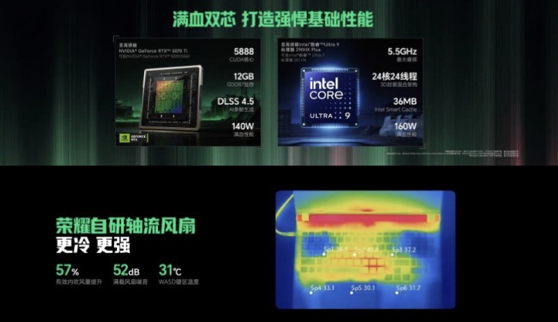 性能释放是游戏本的生命线,也是荣耀此次最大的技术看点。针对传统旗舰游戏本受限于散热能力、性能释放长期难以突破250W的行业痛点,荣耀自研了“东风尾喷散热引擎”,在行业内首创“2+4”轴流风扇散热结构。这一设计是对风道逻辑的重新思考:通过轴流风扇的特殊叶片角度与排布方式,结合三矩形矢量热管、三角蝉翼长短鳍片以及键盘辅助进风设计,将内吹区域的风量较传统方案提升了57%。最终,这一“最强温控装甲”带来了20W的性能释放提升,使整机持续输出功率突破至270W。